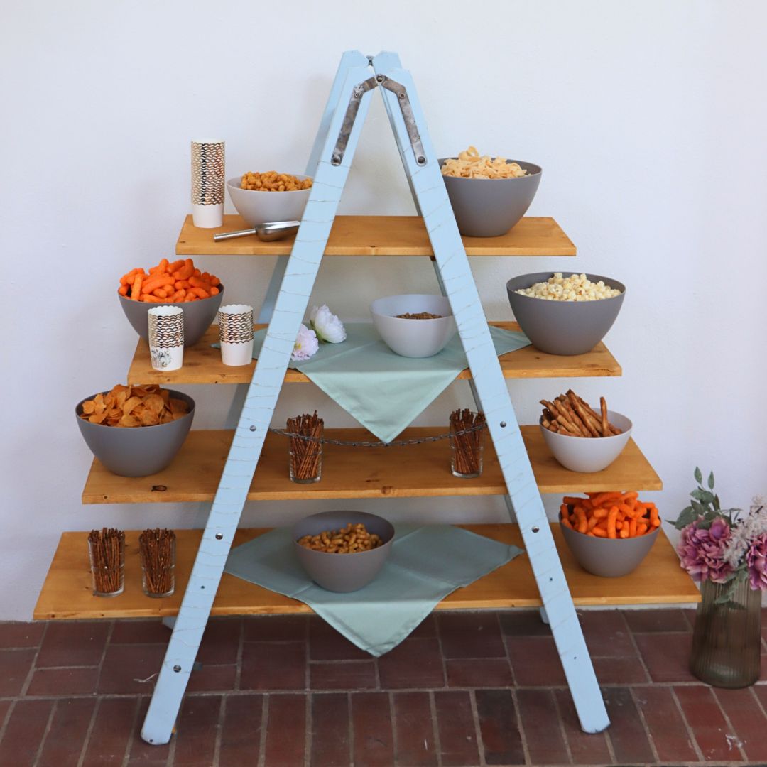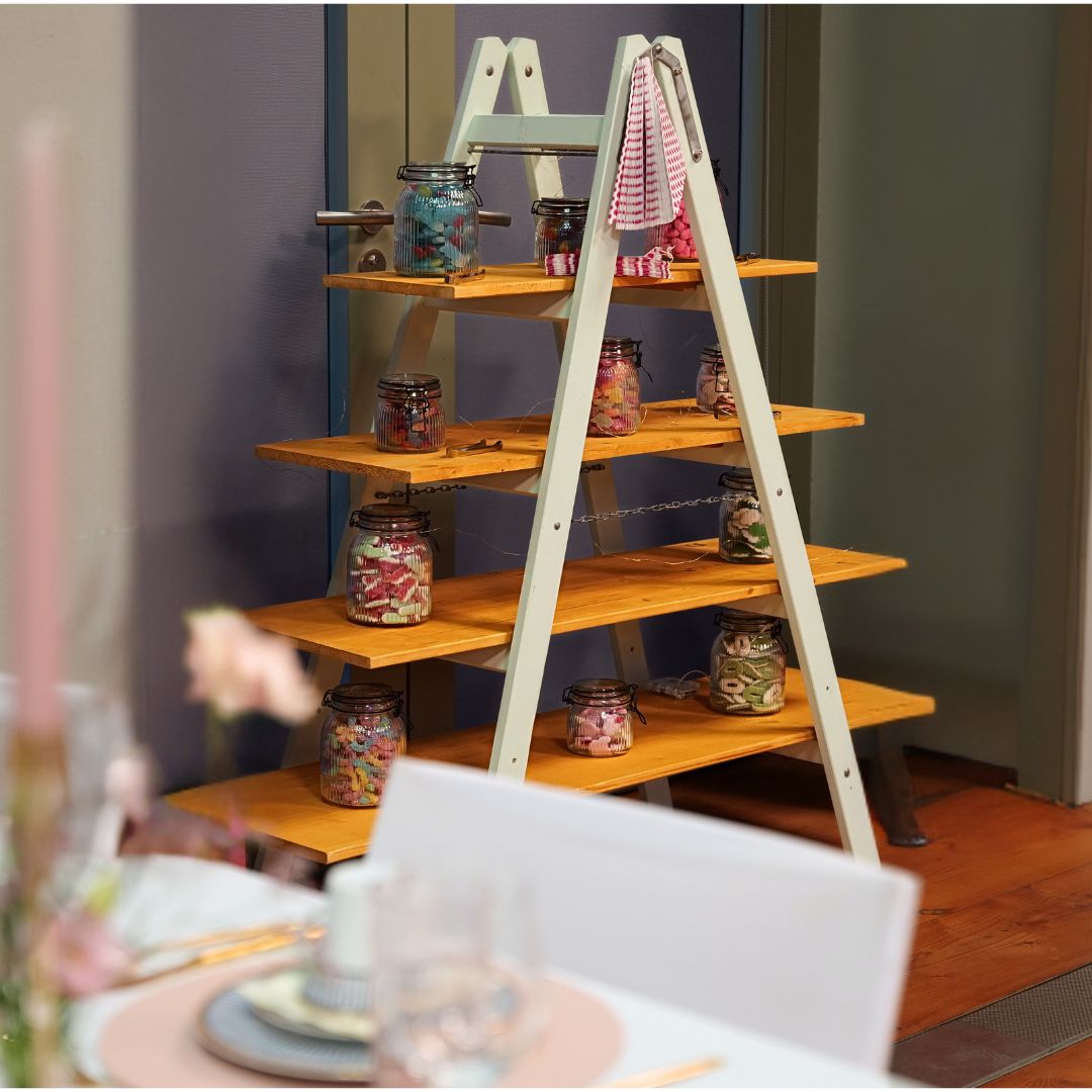 Mit mit Süßigkeiten oder salzigen Snacks befüllten Behältnissen eignen sich die Leiterregale ideal, um nicht nur schick auszusehen, sondern auch um als Candybar Groß und Klein mit Naschereien zu versorgen.