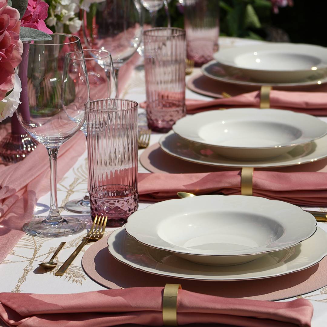 Verfügbar sind Speise-, Suppen- und Dessertteller sowie Mokkatasse inkl. Untertasse und eine kleine Salatschüssel. Ihr könnt einzelne Teile mieten oder direkt das gesamte Set. Als Set sowohl für Kaffee- als auch für Dinnermahlzeiten geeignet.