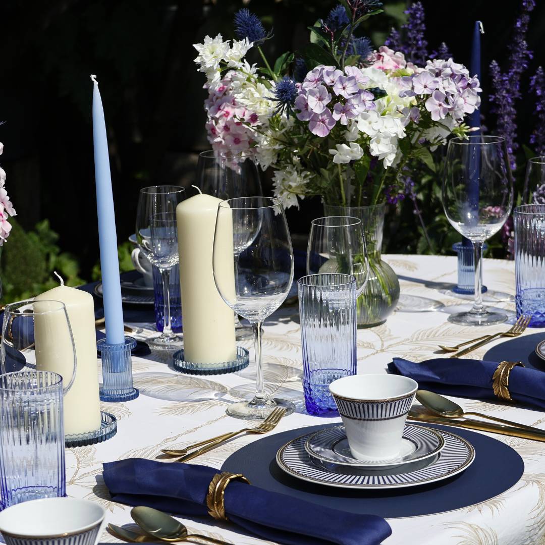 Kerzenteller in blau hergestellt aus Glas mit Riffelmuster. Passen mit ihren Blautönen perfekt zu unseren Kollektionen Porto und unseren Stumpenkerzen von Ester und Erik.