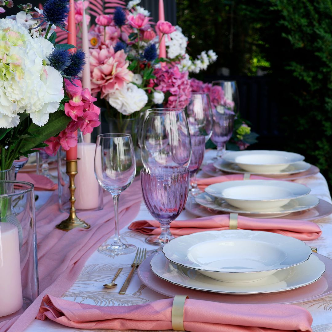 Kollektion Tokyo Classic strahlt eine klassische Eleganz aus durch die zart rosafarbenen Platzteller aus Glas sowie die rosafarbene Serviette und das Kelchglas. Dies wird untermauert durch die goldenen Akzente der vintage Kerzenständer, den schlichten goldenen Serviettenringen und dem moderne Besteck in Gold sowie dem cremefarbenen oder blauen Geschirr mit Goldrand.